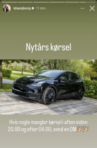 Tidligere Love Island-deltager Ida, der har over 53.000 følgere på Instagram, Nytårsdag delte hun samtidig en story, hvor hun fremviste en Tesla Model Y og skrev, at man kunne sende en besked, hvis man manglede kørsel ”inden 20.00 og efter 04.00”.
